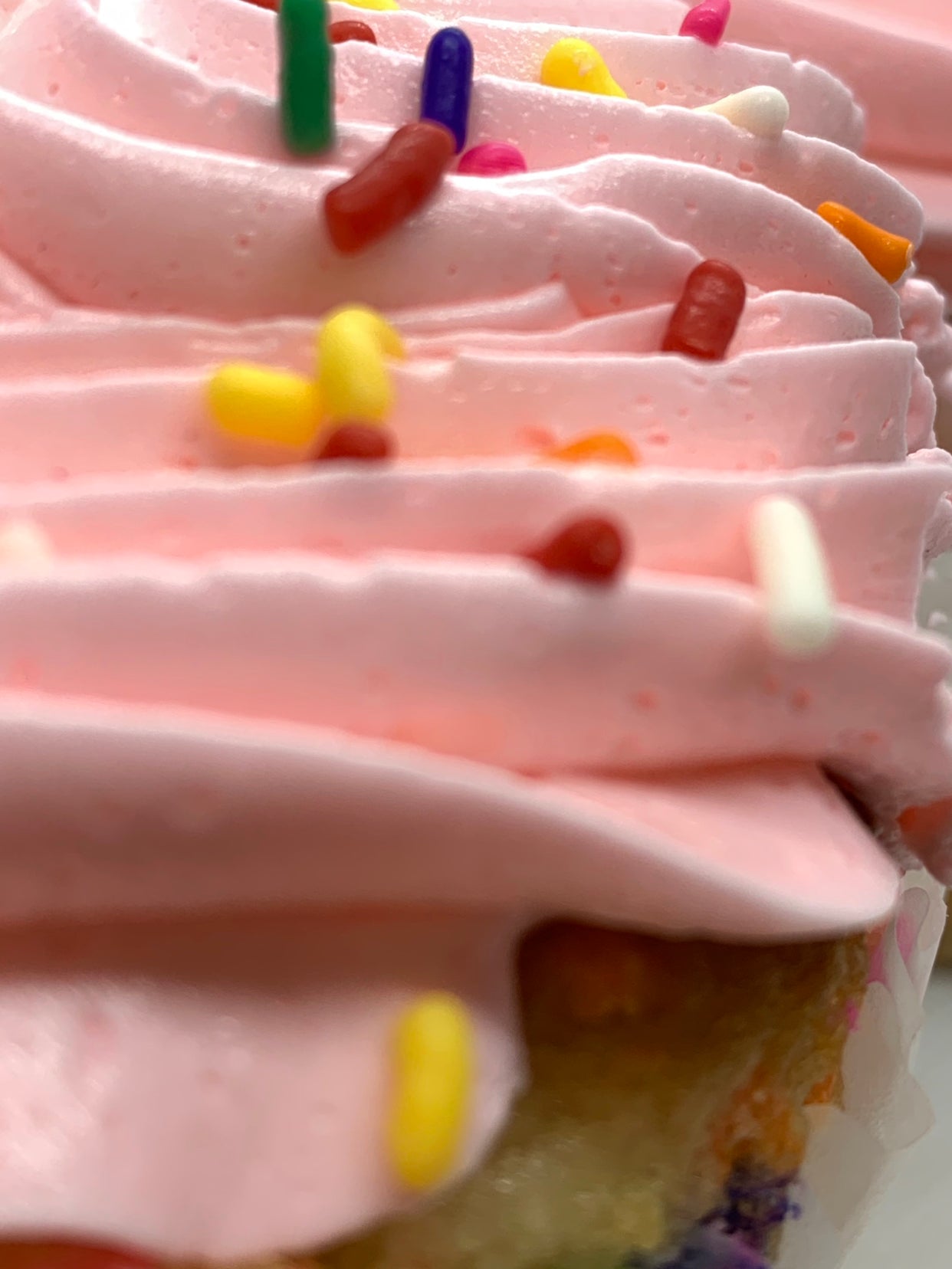 1 Dozen Confetti Colossal Cupcakes with pink buttercream and rainbow sprinkles