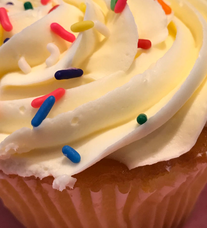 White confetti cake with buttercream frosting and rainbow sprinkles made gluten free