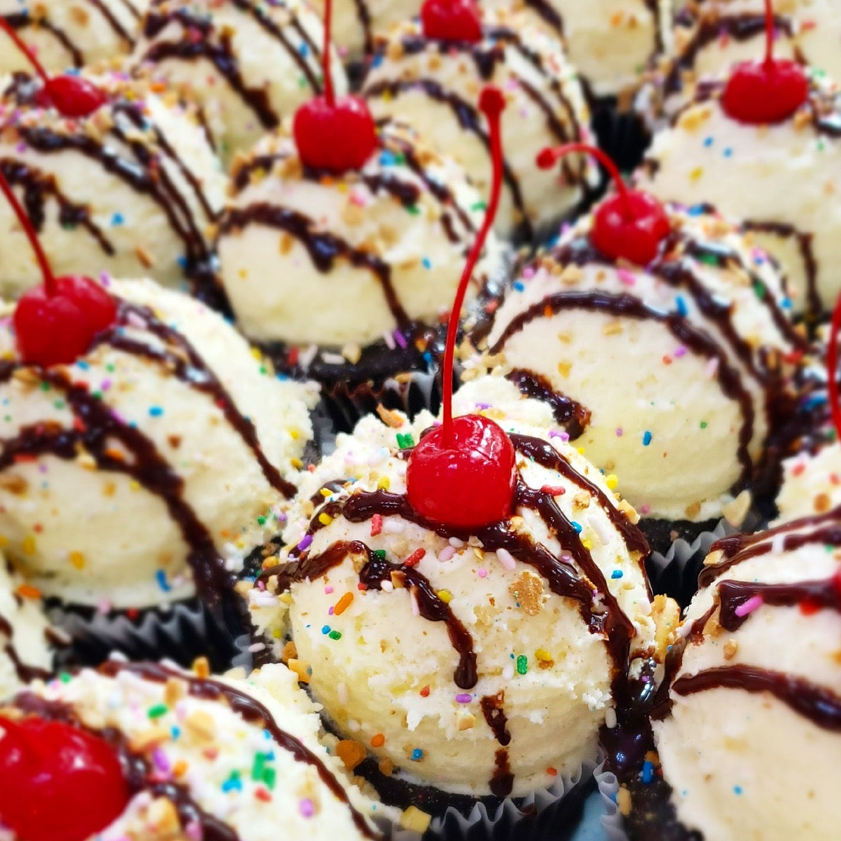 Chocolate cake with chocolate fudge filling buttercream frosting, peanut and rainbow sprinkles, chocolate drizzle and topped with a cherry